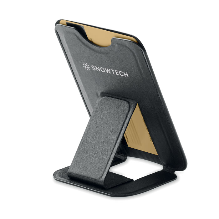 Etui na karty kredytowe z PU, z magnetycznym zamknięciem i funkcją stojaka na telefon, z taśmą 3M na odwrocie.