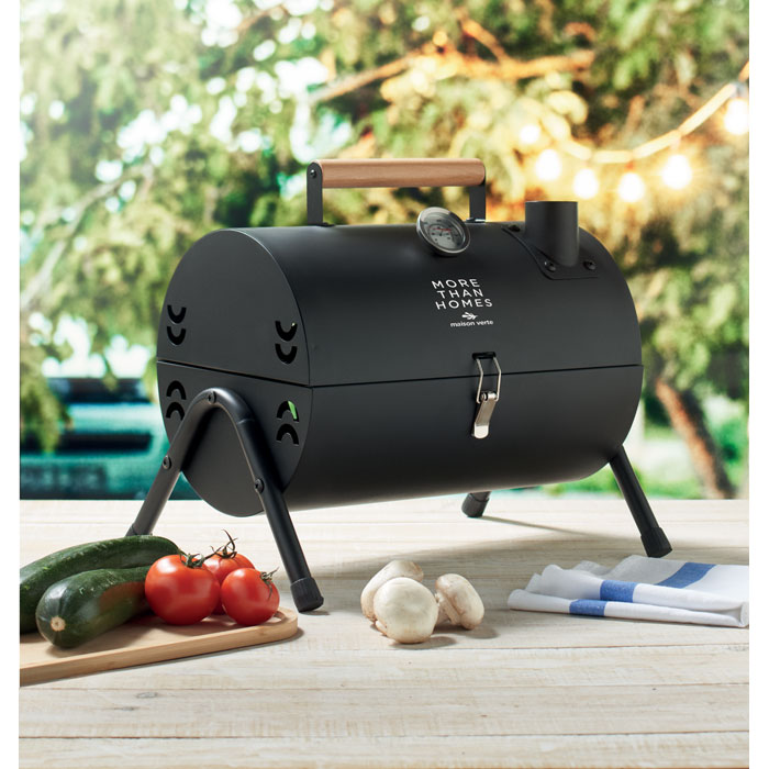 Przenośny grill żeliwny z kominem i wskaźnikiem temperatury. Palenisko malowane proszkowo na czarno. Zatrzask blokujący i drewniany uchwyt do przenoszenia.