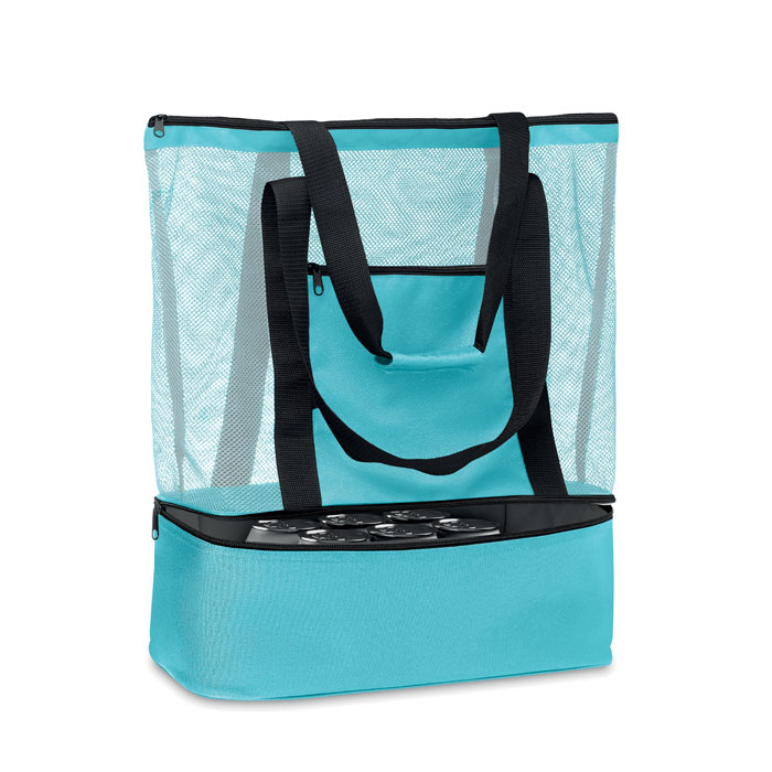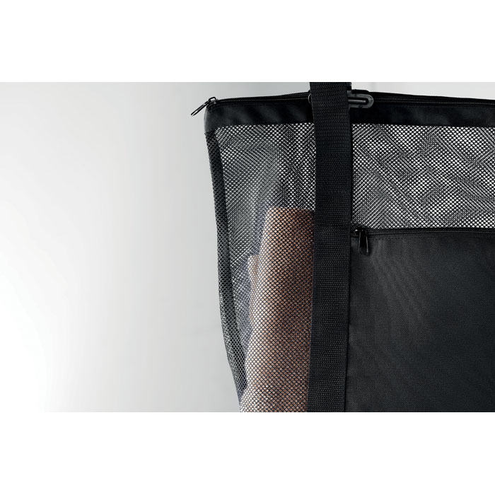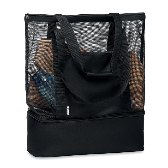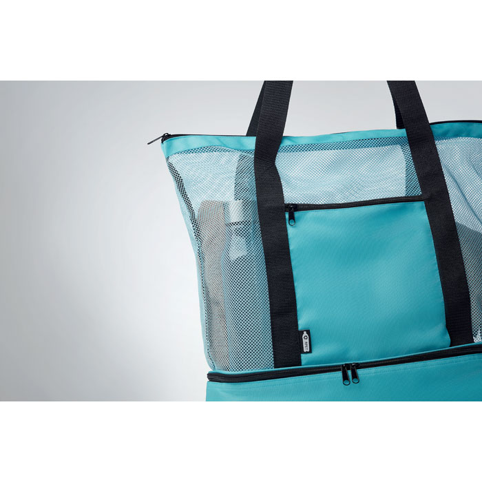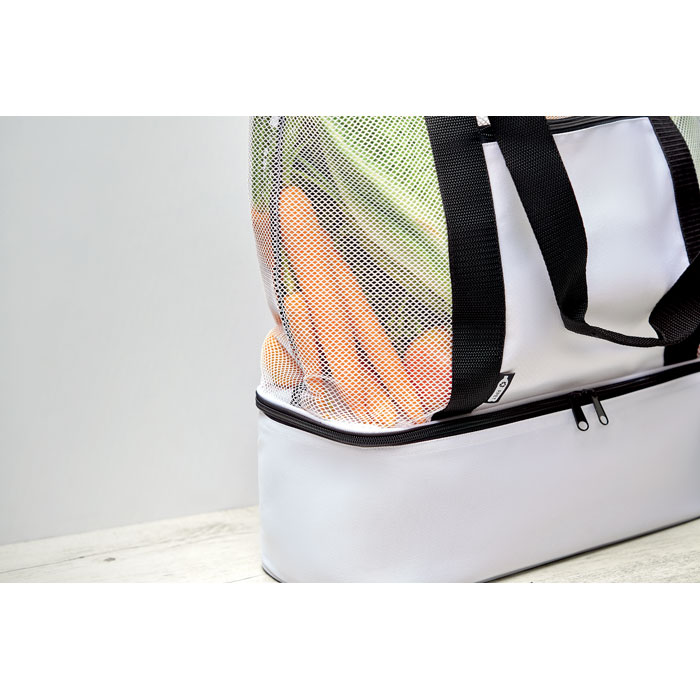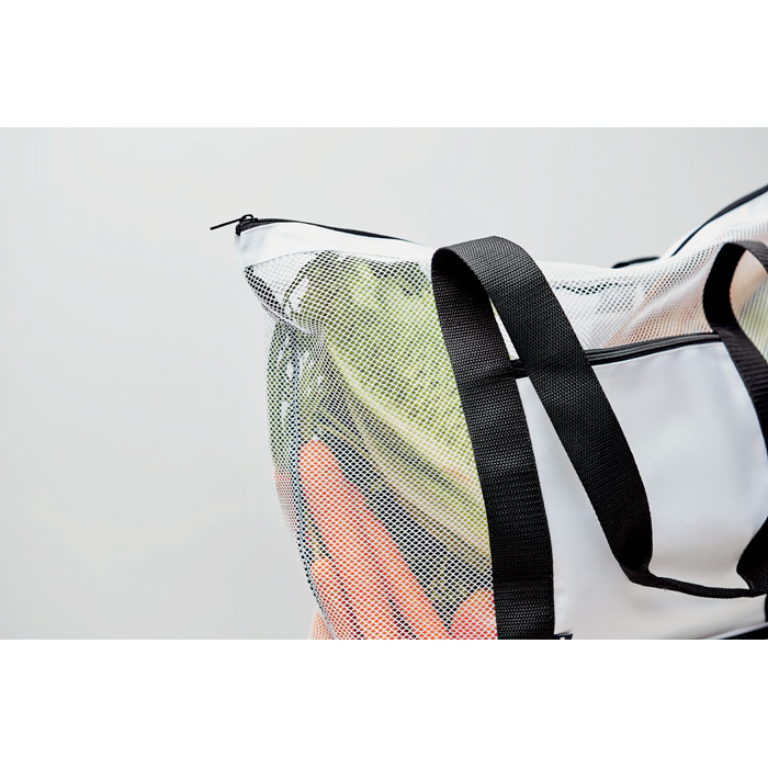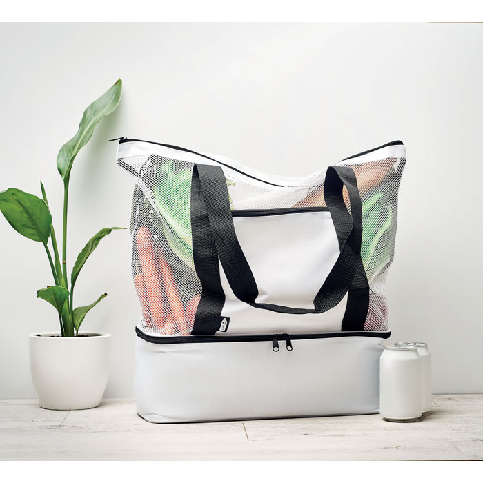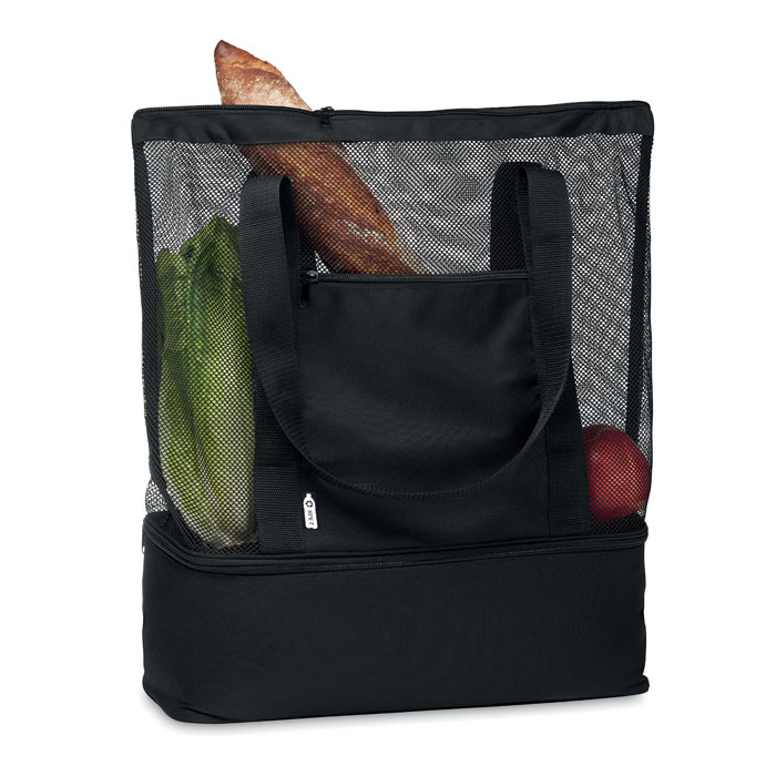 Torba na zakupy z siatki RPET z długimi uchwytami i kieszenią na zamek z przodu. W dolnej części torby znajduje się część termoizolacyjna, 600D RPET.