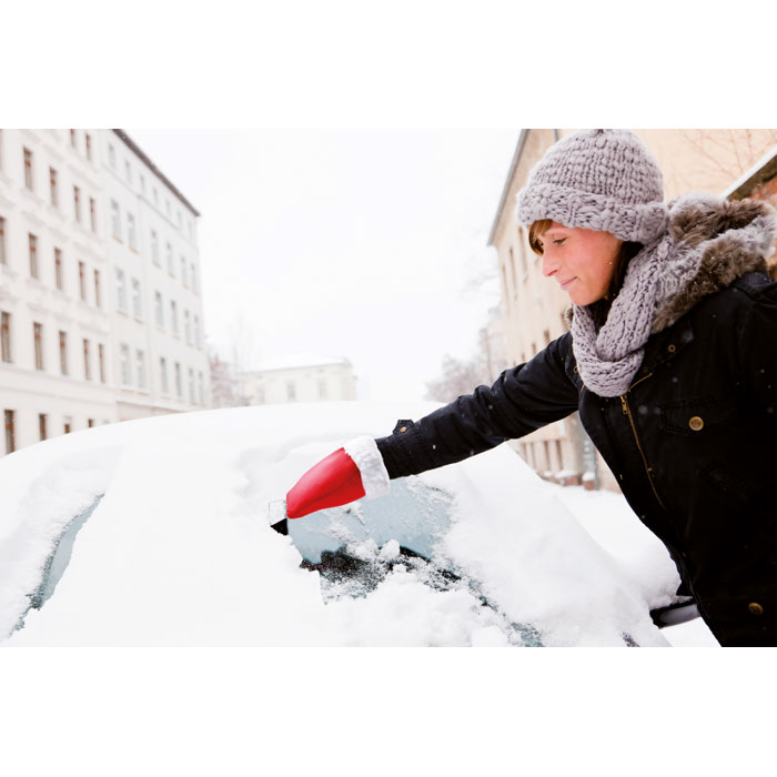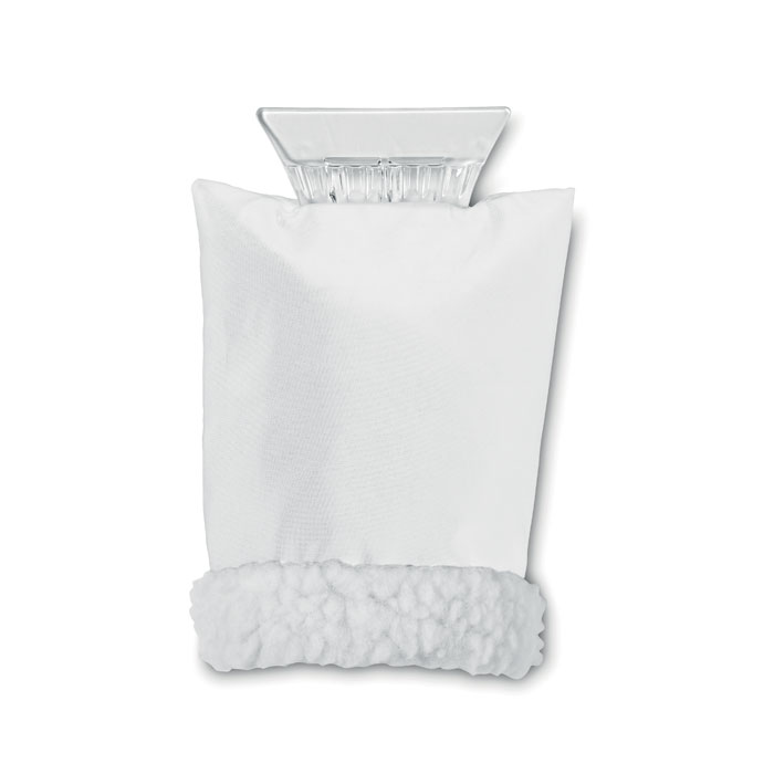 Plastikowa skrobaczka do szyb z ochronną i ciepłą rękawicą ze sztucznym kożuszkiem.