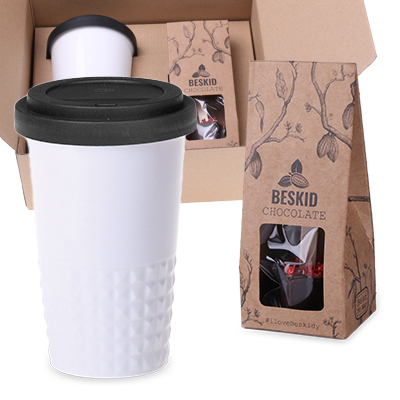 Zimowy zestaw z kubkiem Freedom Excellence Classic z dowolnym kolorem wieczka oraz Choco Stick produkcji rzemieślniczej z ciemnej czekolady z dodatkiem liofilizowanych truskawek. Wszystko zapakowane w eleganckie ekoOpakowanie, zdobione motywem świątecznym. Zestaw stworzony dla poszukujących nieszablonowych rozwiązań.