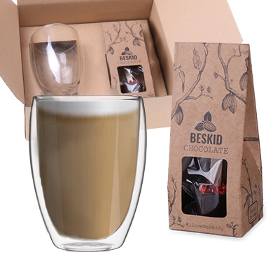 Zimowy zestaw z dwuścienną szklanką Virgo oraz Choco Stick produkcji rzemieślniczej z ciemnej czekolady z dodatkiem liofilizowanych truskawek. Wszystko zapakowane w eleganckie ekoOpakowanie, zdobione motywem świątecznym. Zestaw stworzony dla poszukujących nieszablonowych rozwiązań.