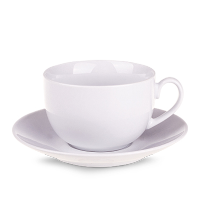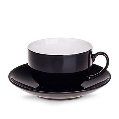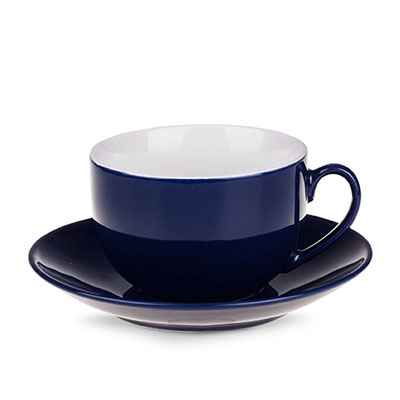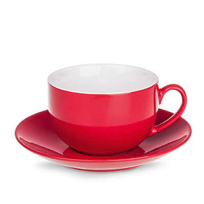 Obła filiżanka reklamowa z kolorowym szkliwem na zewnątrz i białym wnętrzem. Fason dostępny w wielu wersjach kolorystycznych.