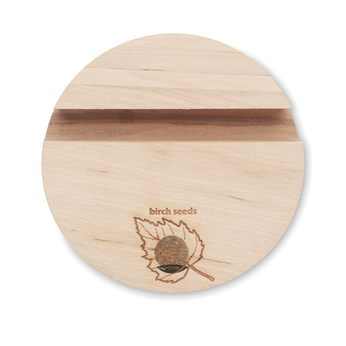 Stojak na telefon z drewna sosnowego. Zawiera nasiona sosny (pinus nigra), które można zasadzić, a powstałe drzewka będą rosły ok. 30 cm rocznie. Wyprodukowano w UE.