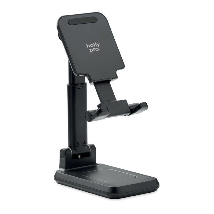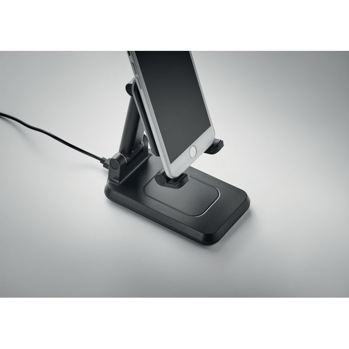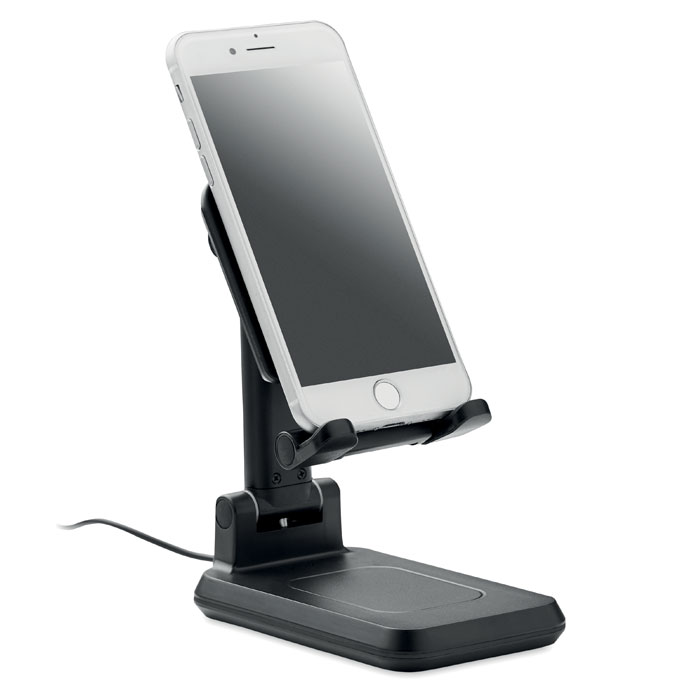 Bezprzewodowa ładowarka 15W z ABS dla 1 urządzenia, z wysuwanym i składanym uchwytem na smartfon i z podstawką. Wyjście: DC 9V/1,67A (15W) do szybkiego ładowania. Kompatybilna z najnowszymi systemami Android, iPhone® 8, X i nowszymi.