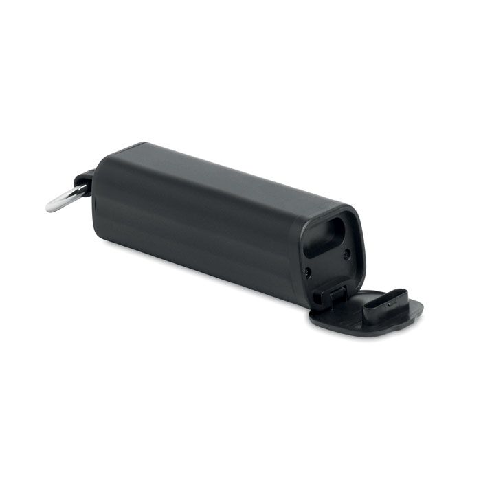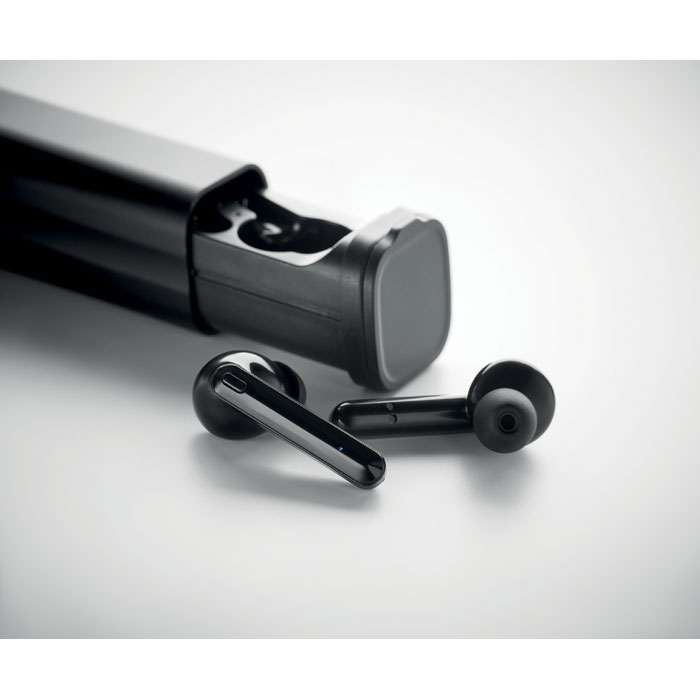 Bezprzewodowe słuchawki True Wireless Stereo (TWS) 5.0 z wbudowanym akumulatorem o pojemności 35 mAh. Czas odtwarzania ok. 3 godziny. W zestawie kabel micro USB do ładowania i stacja ładująca o pojemności 250 mAh. Z brelokiem do kluczy i podstawką na telefon.