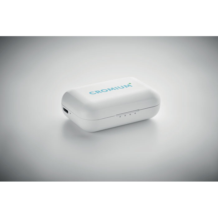 Zestaw 2 słuchawek True Wireless Stereo (TWS) 5.0 z wbudowaną baterią 30 mAh. Czas działania ok. 3 godziny. W zestawie kabel do ładowania micro USB i stacja ładująca 185 mAh.