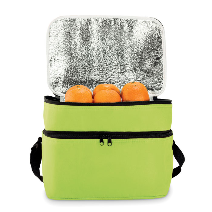 Torba termiczna 600D z 2 przegrodami wyściełanymi folią aluminiową. Posiada regulowany pasek na ramię.