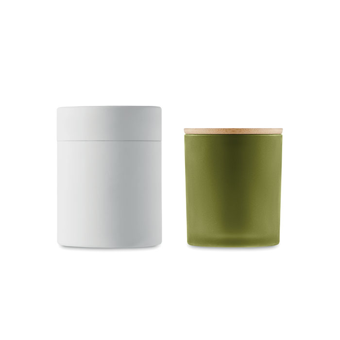 Wosk roślinny, świeca roślinna o zapachu cynamonu, wanilii, drzewa sandałowego lub jaśminu w szklanym, matowym pojemniku z bambusową pokrywką. 120 gr. Czas palenia: 20 godzin. Prezentowana w papierowym pudełku upominkowym w kształcie tuby.
