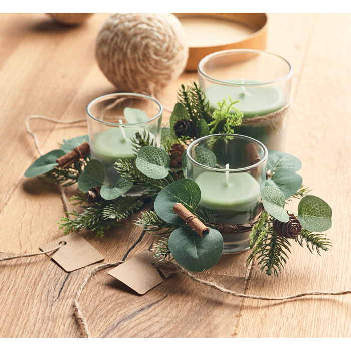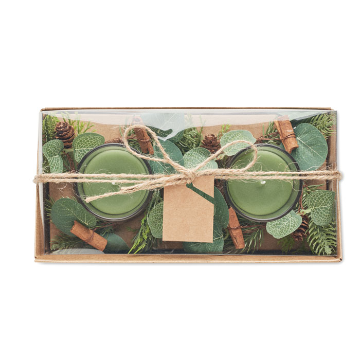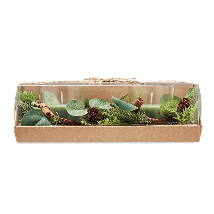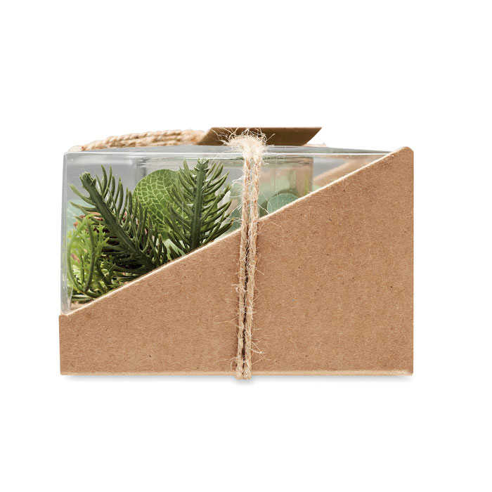Zestaw 2 szklanych świeczników (120 gr) z aranżacją leśną. Zapakowane w karton i pudełko PVC, ze sznurkiem jutowym. Do zestawu dołączone są świece.