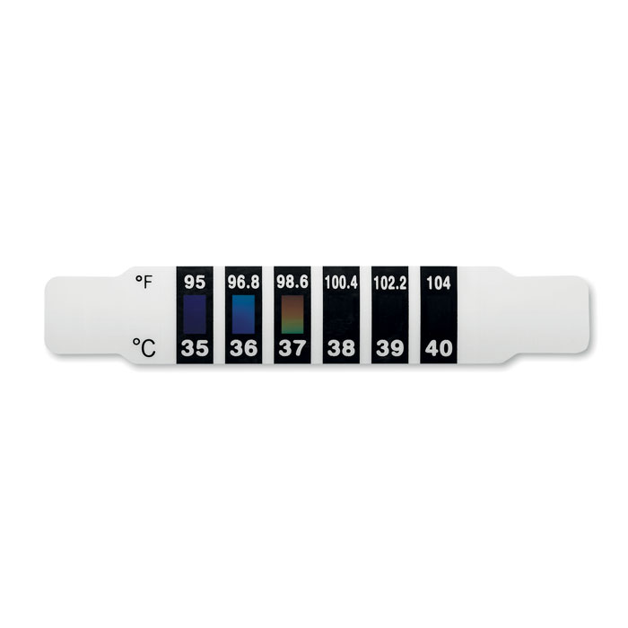 Wskaźnik temperatury ciała wykonany z PET. Wskazuje temperaturę w stopniach Celsjusza i Fahrenheita. Grubość 0.18mm.