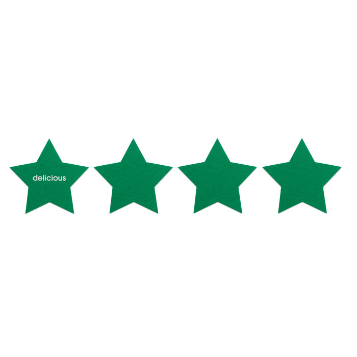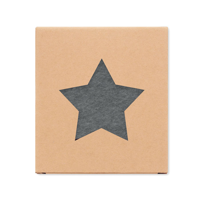 Zestaw 4 podkładek filcowych RPET w kształcie gwiazdek w pudełku z papieru kraft.