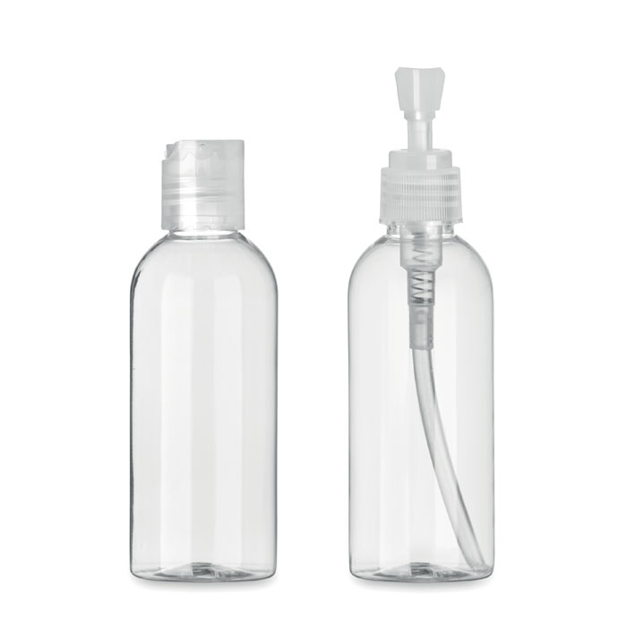 Zestaw butelek w woreczku PEVA. Butelki te można napełnić środkiem dezynfekującym do rąk, mydłem lub innymi płynami, zapewniającymi bezpieczeństwo i czystość. Jedna butelka ma klapkę, która ułatwia użycie żelu. Druga butelka posiada pompkę, która idealnie nadaje się do płynów. Obie butelki wykonane są z tworzywa PET nadającego się do. Pojemność 100 ml każda.