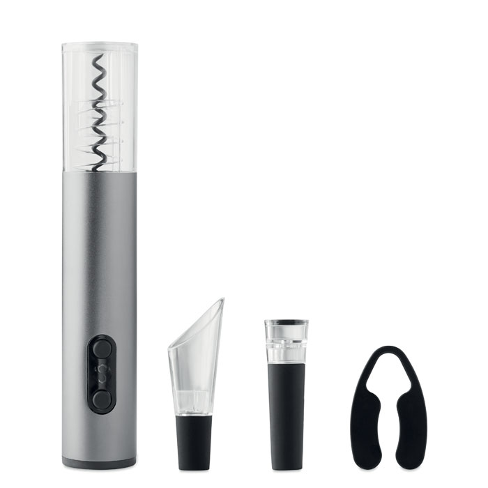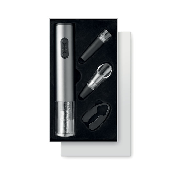 Zestaw do wina w pudełku. Zawiera korek do wina, nalewak, nóż do folii i elektryczny korkociąg. Nie zawiera 4 baterii AA.