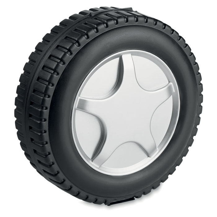 Zestaw narzędzi w opakowaniu w kształcie opony. 25 sztuk: przedłużacz, śrubokręt nasadowy, kombinerki, 5 nasadek, 3 klucze sześciokątne, 10 końcówek, 2 śrubokręty precyzyjne i taśma.