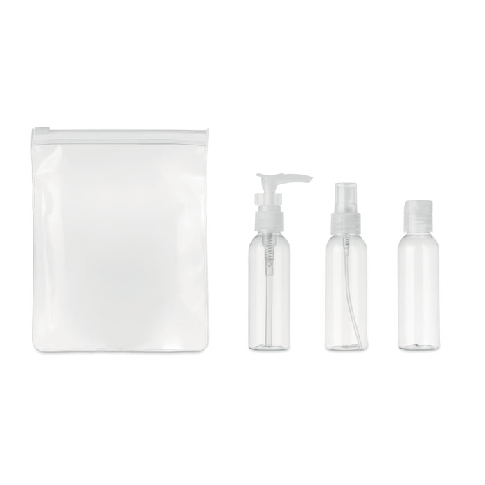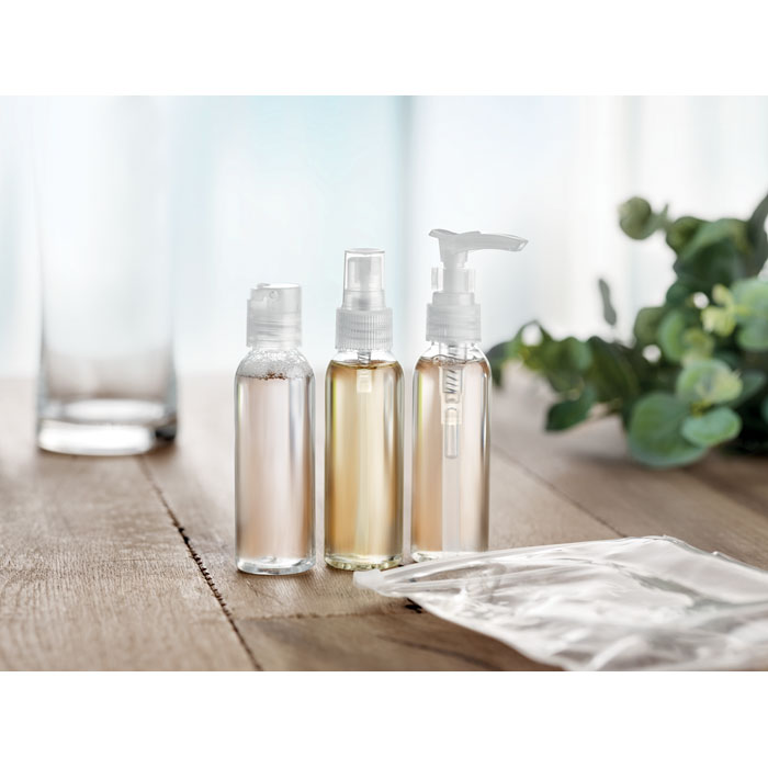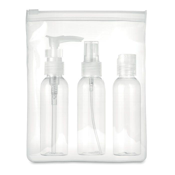 Zestaw podróżny, zawierający 3 puste pojemniki z PP zapakowane w etui z transparentnego PEVA. Pojemność każdego to 60ml.