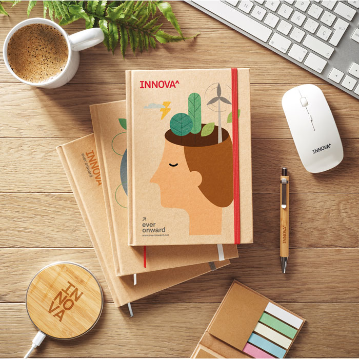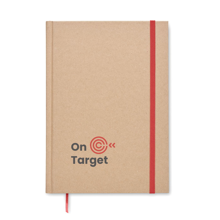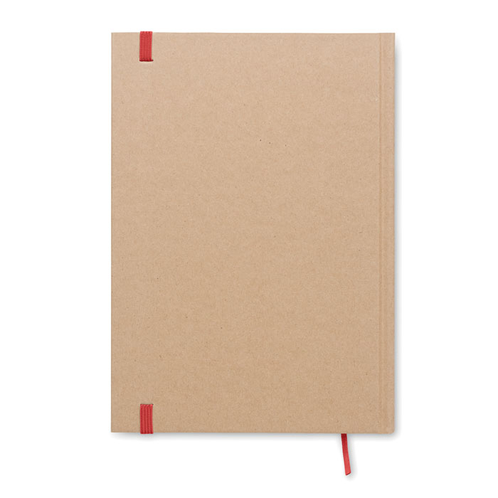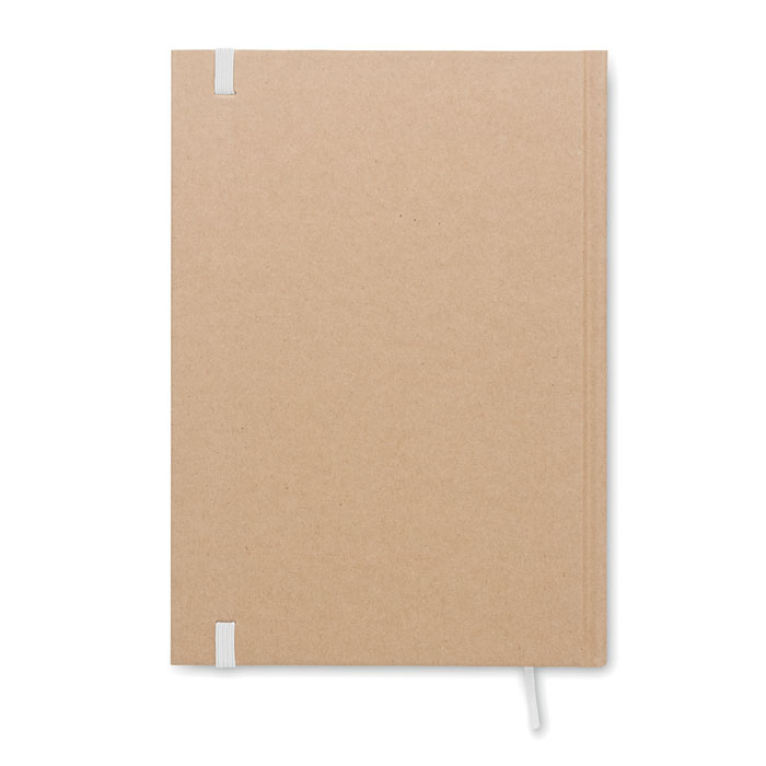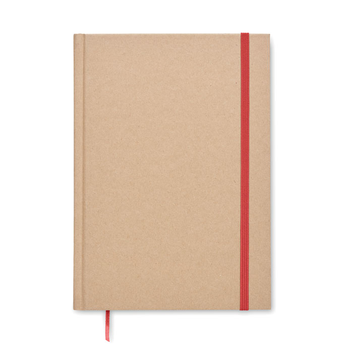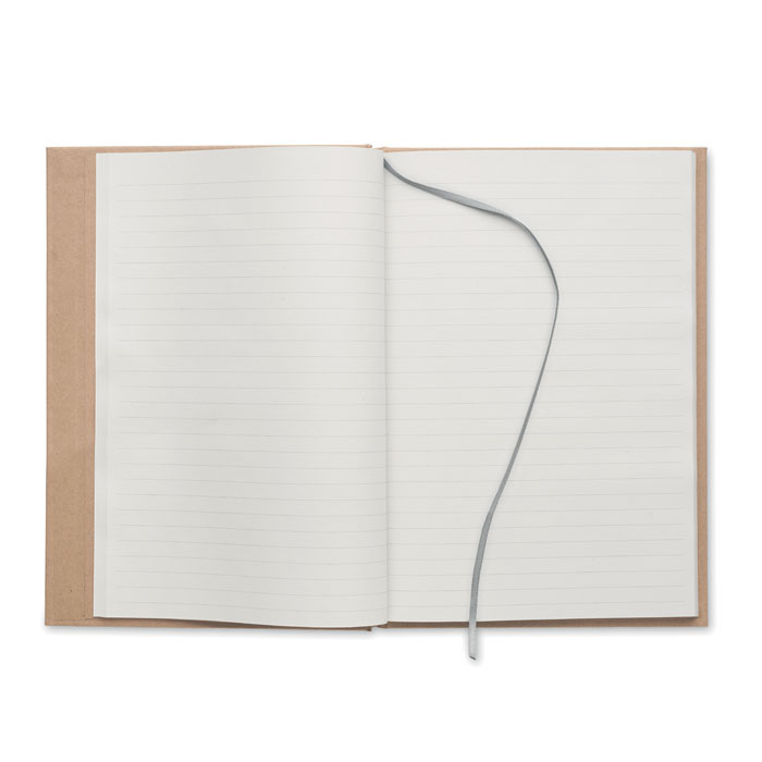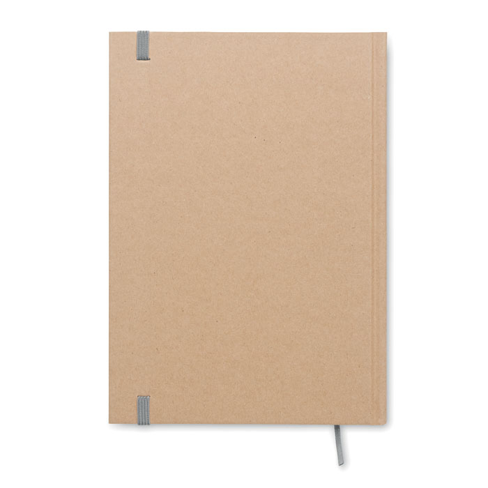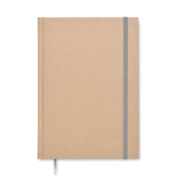 Notatnik A5 w twardej okładce z kartonu z recyklingu. 160 stron w linie z papieru makulaturowego (80 kartek 80 g/m²). Dopasowana gumka zamykająca i tasiemka do oznaczania stron. Made in EU.