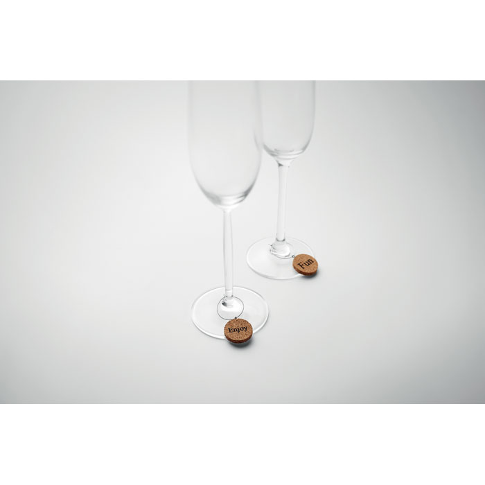 Zestaw 6 znaczników korkowych do kieliszków, pakowane w pudełku. Znaczniki mają jednostronnie nadrukowany napis.